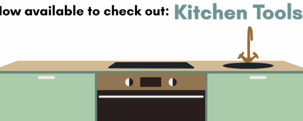With the exception of the cake pans, all of the tools come in a kit with a cookbook and utensils, such as an ice cream scoop or spatula. A full list of what’s included in each kit is available on browser cards at the circulation desk on the first floor, while the full collection can be found on the second floor near the entrance to Youth Services.